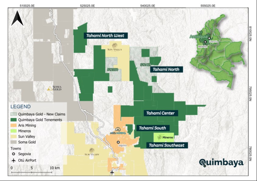Figure 1: Location map showing the new Segovia concession applications (Placas 512350 and 512469) within Quimbaya's expanded Antioquia land position, alongside the flagship Tahami Project target areas