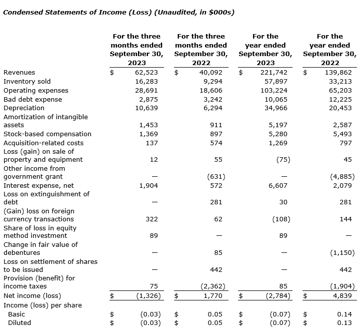 - Cash flow from operations was $40.5-million for the year ended Sept. 30, 2023, compared with $26.3-million for the year ended Sept. 30, 2022.