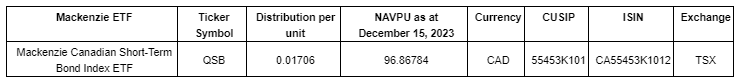 Mackenzie Investments has made a revision to the final year-end reinvested distribution for Mackenzie Canadian Short-Term Bond Index ETF, which trades on the Toronto Stock Exchange, for the 2023 tax year.