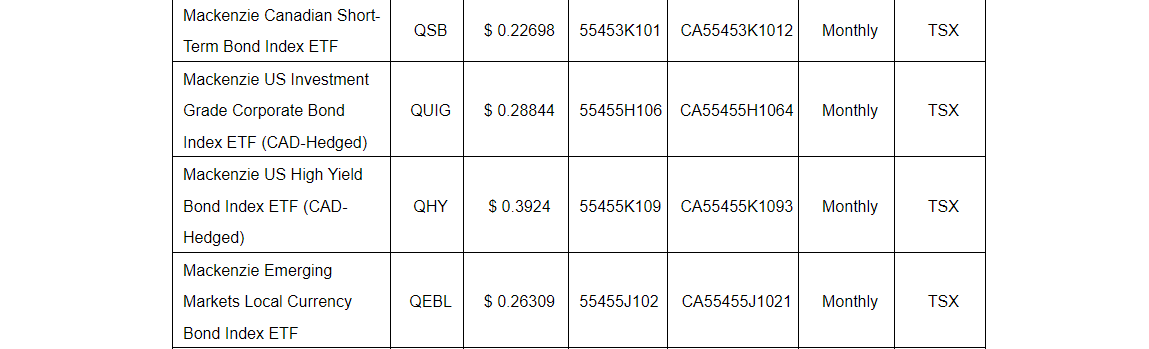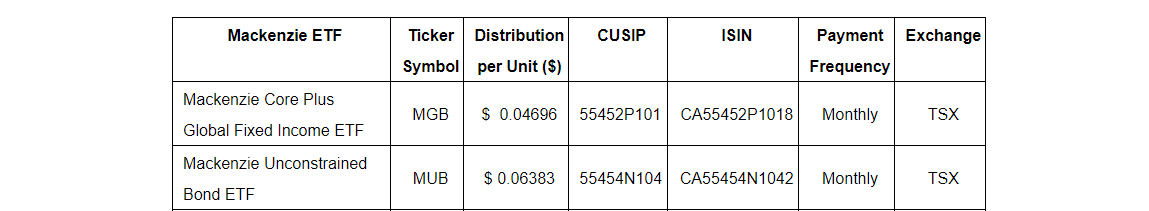 Mackenzie Investments has declared the January, 2024, monthly cash distributions for its exchange-traded funds listed in an attached table that trade on the Toronto Stock Exchange and Cboe Canada. Unitholders of record on Feb. 2, 2024, will receive cash distributions on Feb. 9, 2024.