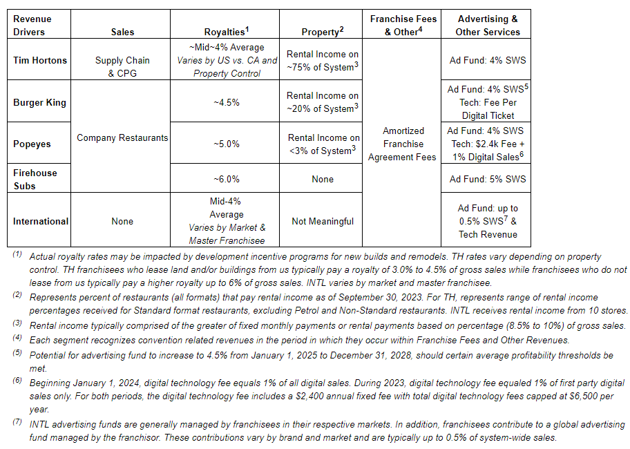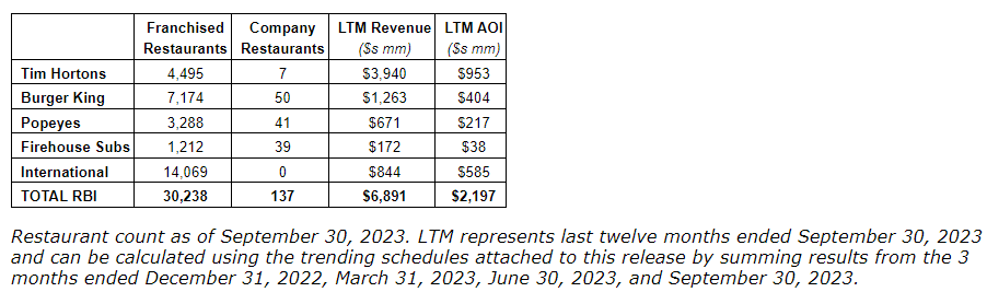 Beginning with the fourth quarter and year ended Dec. 31, 2023, Restaurant Brands will report results under five reportable segments: (1) Tim Hortons (TH); (2) Burger King (BK); (3) Popeyes Louisiana Kitchen (PLK); (4) Firehouse Subs (FHS); and (5) international (INTL). The TH, BK, PLK and FHS segments include results from each brands' operations in the United States and Canada. INTL includes consolidated results from each brands' operations outside of the United States and Canada. This shift in reportable segments reflects how the company's leadership intends to oversee and manage the business going forward.