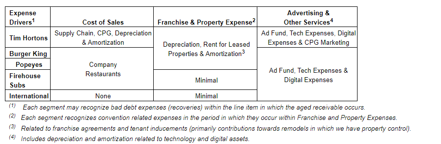The company's primary business expenses are related to the following: (i) cost of sales, consisting primarily of costs associated with the management of its TH supply chain, cost of products sold to retailers, and food, paper and labour costs of company restaurants; (ii) franchise and property expenses, consisting primarily of depreciation of properties leased to franchisees, and rental expense associated with properties subleased to franchisees; and (iii) advertising expenses and other services consisting primarily of expenses relating to marketing, advertising and promotion, technology initiatives, and depreciation and amortization. As a reminder, the company generally manages advertising expenses to equal advertising revenues in the long term, however in some periods there may be a mismatch in the timing of revenues and expenses, or higher expenses due to the company's support of certain marketing program initiatives -- such as Restaurant Brands' $80-million investment behind the Tim Hortons Canada advertising fund in 2021 and its current (Q4 2022 through Q4 2024) $120-million advertising investment in Burger King U.S. as part of the brand's multiyear Reclaim the Flame program.