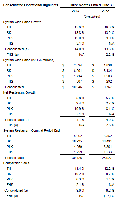For the second quarter of 2023, the increase in systemwide sales was driven by comparable sales of 10.2 per cent, including rest-of-the-world comparable sales of 11.6 per cent and U.S. comparable sales of 8.3 per cent, and net restaurant growth of 2.4 per cent.