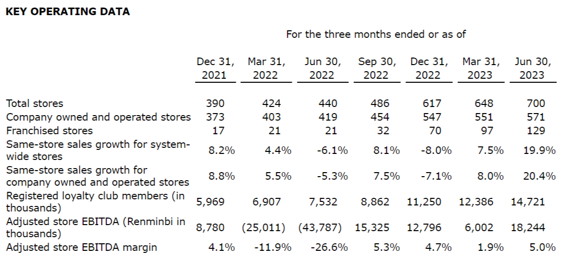 As of June 30, 2023, the company's total cash and cash equivalents and short-term investments were 392 million renminbi ($54.1-million (U.S.)), compared with 611.5 million renminbi as of Dec. 31, 2022. The change was primarily attributable to the settlements with investors who entered into an equity support agreement dated March 8, 2022, as amended, with the company and cash disbursements as a result of the rapid expansion of the company's business and store network nationwide.