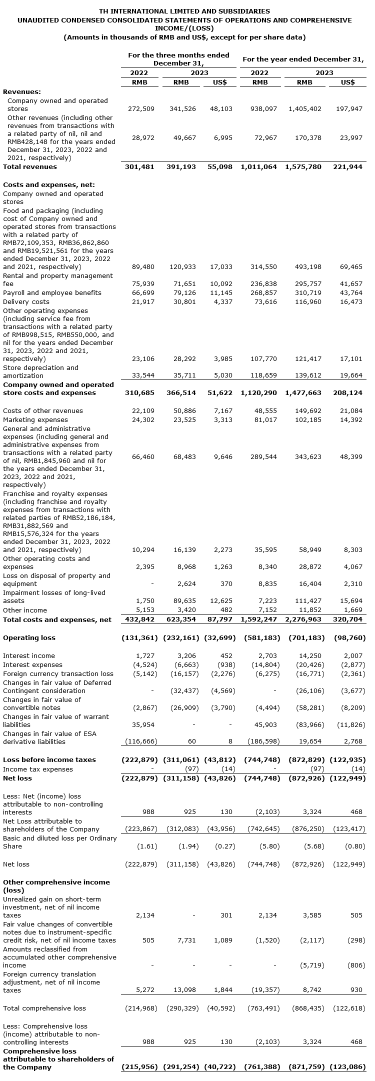As of Dec. 31, 2023, the company's total cash and cash equivalents, time deposit, and short-term investments were 220.8 million renminbi ($31.1-million (U.S.)), compared with 611.5 million renminbi as of Dec. 31, 2022. The change was primarily attributable to the settlements with investors that entered into an equity support agreement (ESA) dated March 8, 2022, as amended with the company, and cash disbursements as a result of the rapid expansion of TH International's business and store network nationwide, offset by an increase in bank borrowings.
