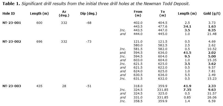Renegade Gold Inc. has released initial results from the first three drill holes at its advanced Newman Todd deposit. All three drill holes successfully intercepted high-grade mineralization and have provided further evidence for deep-rooted high-grade structures, which remain open along strike and at depth.