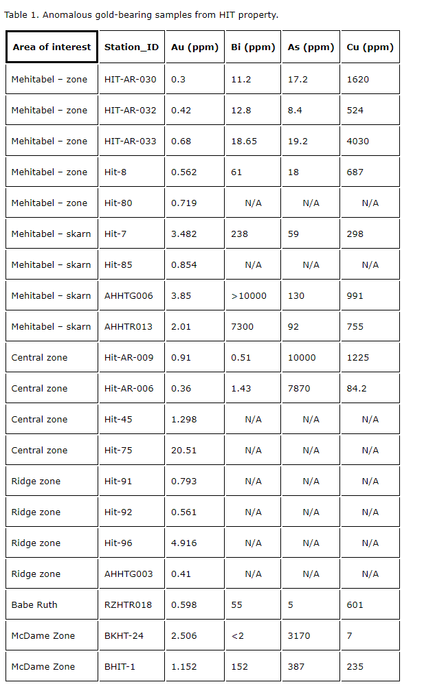 the siltstone and the intrusive stock here have returned strongly anomalous gold values both in the vein and skarn zones, up to 3.4 g/t Au. This zone was tested in HIT -003, results pending.