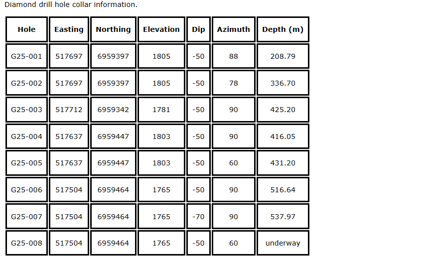 Completed holes G25-001 to 007 are at the lab, with results from holes G25-001 to 003 expected within the coming week. The company expects a steady flow of results following that.