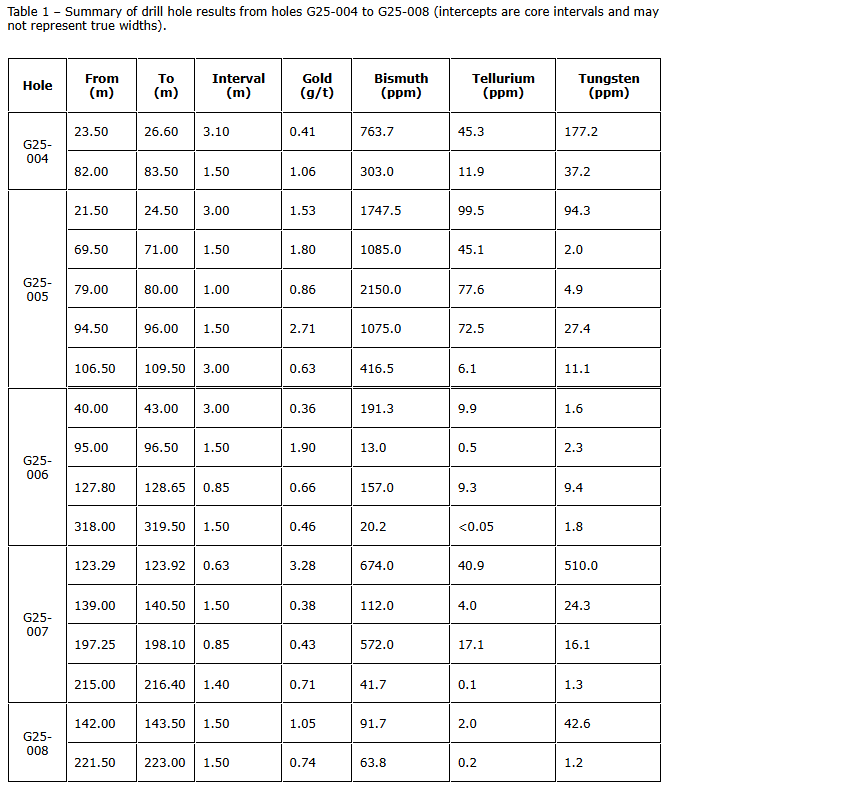 The 2025 program was the maiden drill program on the property and management believes it was the most logical step to evaluate the high-grade results from the 2024 surface sampling on this steep cliff face. Holes G25-004 to G25-008 returned scattered, anomalous gold values over generally narrow widths. The gold mineralization shows coincidence with bismuth, tellurium and tungsten as is typical of a RIRGS occurrence. However, company management is disappointed that the broad interval of sheeted quartz veining observed in the drill core is not well mineralized.
