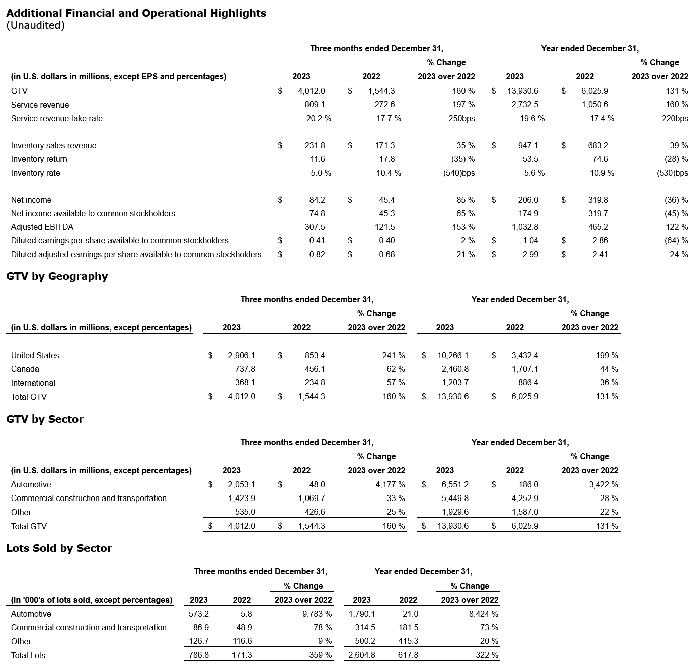 - Service revenue increased 197 per cent year over year to $809.1-million, primarily from the inclusion of $488-million of service revenue from IAA. Service revenue increased 14 per cent year over year on a pro forma combined basis on higher GTV and a higher average service revenue take rate. The service revenue take rate expanded 20 basis points on a pro forma combined basis year over year to 20.2 per cent, driven by growth in marketplace services revenue and a higher average buyer fee rate, partially offset by a lower average commission rate. Growth in marketplace services revenue was driven by higher ancillary revenue and a higher auction-related fee structure in the commercial construction and transportation sector.