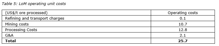 Mining operating cost estimates were prepared by AMC Mining Consultants (U.K.) Ltd. Processing costs were prepared by Soutex while infrastructure and general and administration operating cost estimates were prepared by Robex and reviewed by AMC. LoM operating unit costs are summarized herein.