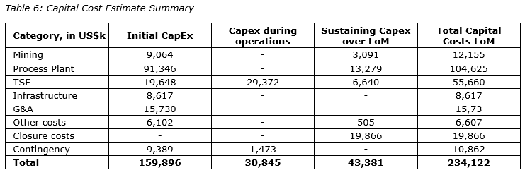 The process plant capital cost estimate was compiled by Soutex with input from Epoch on the TSF and Robex on the water infrastructure and site access roads. Robex has provided estimates for mine establishment, infrastructure facilities, high-voltage power supply and owner's costs.
