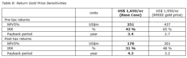 The project sensitivity of the NPV, IRR and payback period with the gold price, as of July 1, 2023, is shown herein.