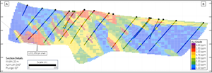 - All Mineral Resources were classified as Inferred. To limit extrapolation, a volume was used to constrain the interpolated blocks to approximately 10 m below the base of the drilling and 40 m lateral to the drilling.