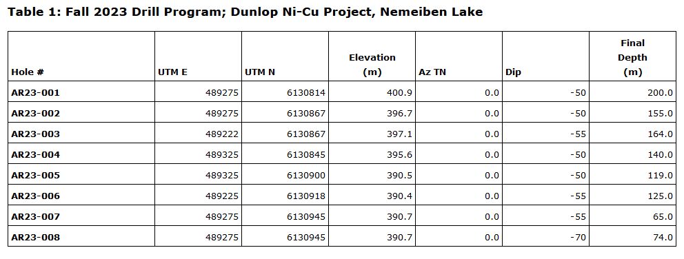 Arya Resources Ltd. has completed its phase 1 drill program on the company's historic Dunlop nickel-copper (Ni-Cu) project in Northern Saskatchewan. The program consisted of 8 drill holes totalling 1045m (Table 1) and was completed between December 7th and 17th, 2023. Alpha Drilling based in Saskatoon, Saskatchewan was contracted to complete the drilling.