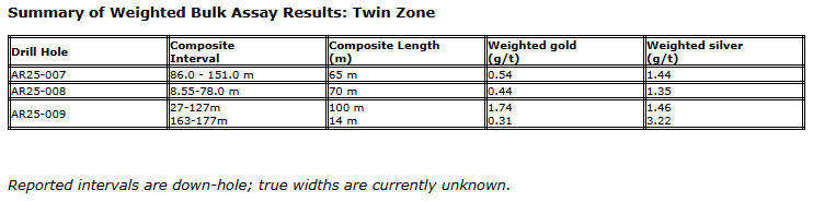 These Twin zone results complement previous drilling at the nearby T-6 zone, where high-grade quartz-vein-hosted mineralization was intersected, including 21.59 g/t Au over 5.84 m (41.7 to 47.54 m), with a higher-grade core of 30.45 g/t Au over 4.06 m (43.48 to 47.54 m), in hole AR25-10.