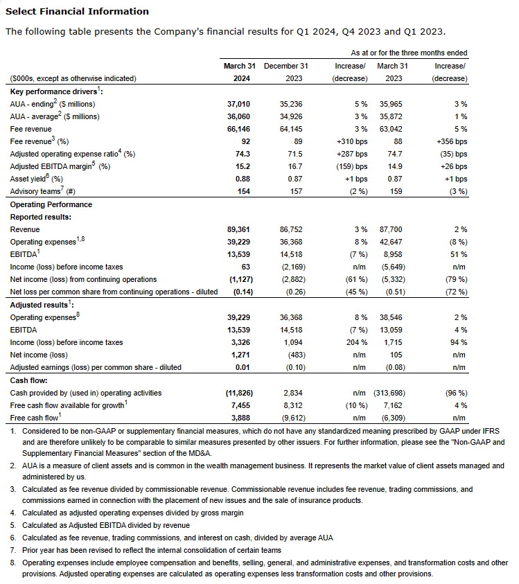 Kish Kapoor, President and Chief Executive Officer, commented, "2024 has started off strong with AUA1,2 reaching $37.0 billion at the end of Q1, up $1.8 billion or 5% over the last three months. This growth was driven largely by continued strength in equity markets and supported by both recruiting and the success that our outstanding advisors have had growing their practices. This AUA1,2 growth led to an increase in recurring fee revenue of 3% sequentially and 5% versus last year. Combined with the Company's vigilant cost containment efforts, revenue growth drove Q1 Adjusted EBITDA1 to $13.5 million, up 4% from Q1 2023."