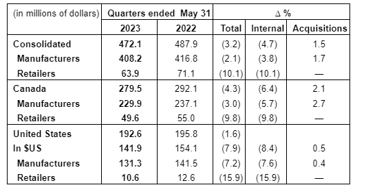 ended May 31, 2023, consolidated sales were $472.1-million, compared with $487.9-million for the second quarter of 2022, a decrease of $15.8-million, or 3.2 per cent, resulting from an internal decrease of 4.7 per cent, while the acquisitions made a positive contribution of 1.5 per cent. It should be noted that in the second quarter of 2022, the corporation had achieved exceptional internal growth of 16.1 per cent, including a 22.7-per-cent increase in the United States.