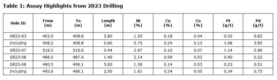 GR23-07 : 2.97% Ni, 0.10% Cu, 4.1 g/t Pt-Pd over 0.44 metres