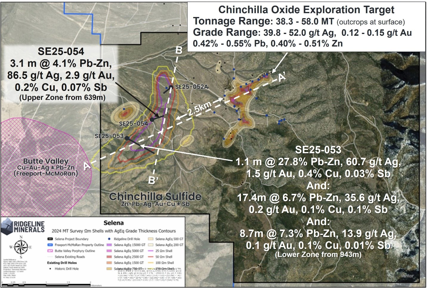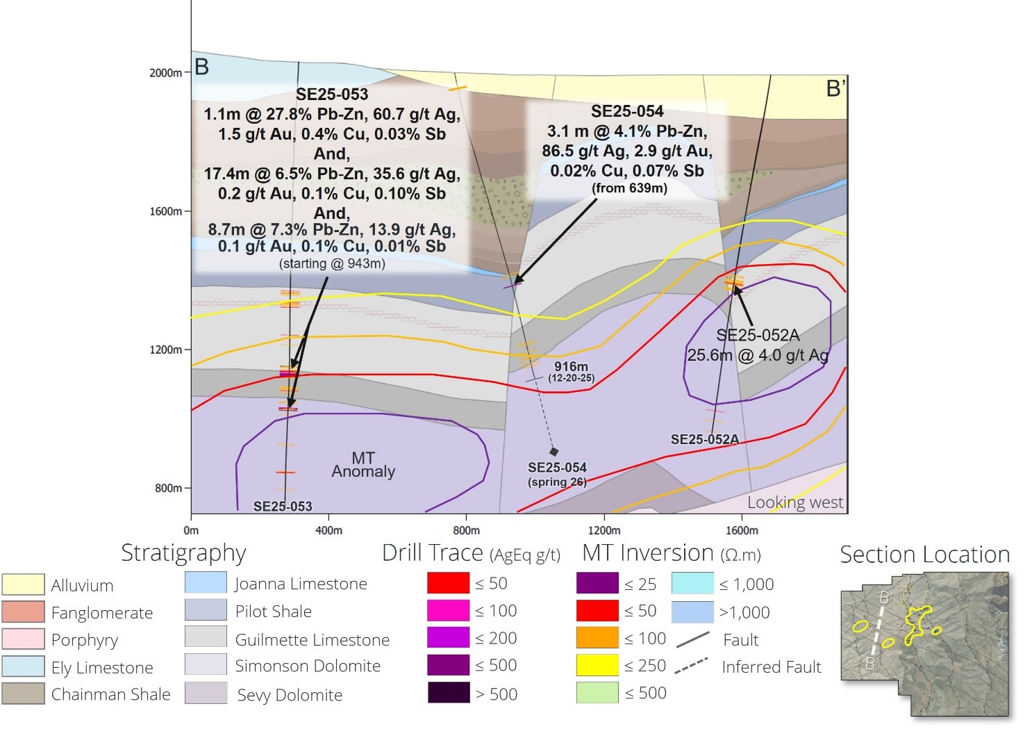 Core hole SE25-054 was a 700 meter ("m") step-out northeast of discovery hole SE25-053 (see December 18, 2025 press release HERE) and intersected an "upper" oxide mineralized intercept of 3.1m grading 86.5 g/t silver ("Ag"), 0.3% zinc ("Zn"), 3.8% lead ("Pb), 2.9 g/t gold ("Au"), and 0.07% antimony ("Sb") (353.1 g/t AgEq or 14.7% ZnEq) starting at 639m downhole (Table 1 & Figure 2). The drillhole was paused at a depth of 916m in mid-December due to winter weather constraints and the Company anticipates re-entering and continuing the hole in the spring to a target depth of up to 1,200m to ensure the hole fully tests the MT target anomaly (Figure 2).