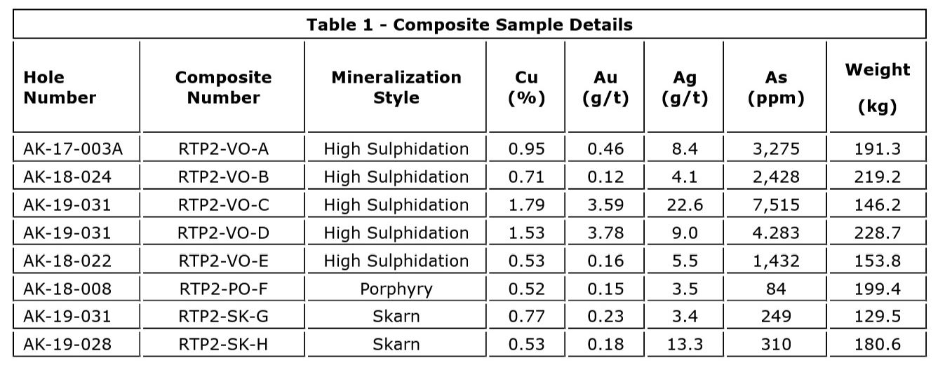 Samples were selected and composited from each of the main mineralization styles at the AntaKori project: high sulphidation, skarn and porphyry. A total of eight composite samples were taken totaling 1,448.7 kg (see Table 1 for sample details and Figures 1 and 2 for sample locations). All samples were taken from Regulus drill hole core stored in the Company's Cajamarca warehouse. The samples were shipped to SGS laboratories in Lima Peru for further sample preparation according to Nuton specifications and protocols, under the supervision of Transmin Metallurgical Consultants S.A.C. Once the samples have been prepared in SGS Lima, a small representative sample split will be sent to Nuton for detailed chemical and mineralogical analyses of each of the composite samples before commencement of the main phase two column test work. Chemical and mineralogical data will be used to predict column test results.