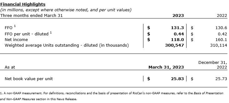 RioCan Real Estate Investment Trust has released its financial results for the three months ended March 31, 2023.