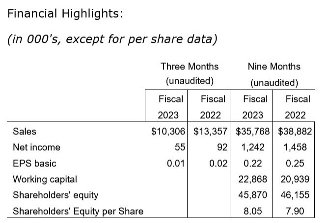 Net income for the quarter ended April 30,2023 was $0.06 million or $0.01 per share, compared to $0.09 million, or $0.02 per share in the prior year. Net income for the nine months ended April 30,2023 was $1.2 million or $0.22 per share, compared to net income of $1.5 million or $0.25 per share in the prior year.