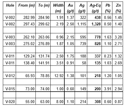 The 1996 exploration program, conducted by Pan American Silver Corp. and La Cuesta International Inc., included 10 diamond drill holes on the Valenciana Property. Multiple base and precious metal mineralized intercepts were encountered. Examples include hole V002 which yielded 2.19 m grading Au 2.50 g/t, Ag 1,115 g/t, Pb 0.5% and Zn 1.4%. Hole V003 yielded 1.87 m grading Au 1.05 g/t, Ag 739 g/t, Pb 1.10% and Zn 2.71%. A broader zone was encountered in hole V012 which yielded 22.25 m grading Au 0.94 g/t, Ag 99 g/t, Pb 0.93% and Zn 0.94%. While these drill holes pre-date the introduction of National Instrument 43-101 - Standards for Disclosure for Mineral Projects ("NI 43-101") standards, they still serve as a good guide for potential future exploration programs.
