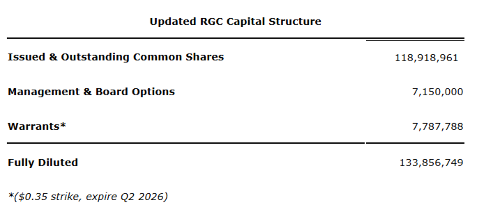 The financing also simplifies the company's capital structure, enhances financial flexibility and significantly strengthens working capital as Relevant Gold enters a pivotal growth phase. As a result, only 7,787,788 warrants remain outstanding (at an exercise price of 35 cents), substantially reducing the prior overhang. The company's updated capital structure is as follows.