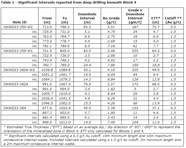 Highlights from the resource expansion drill program, which intersected the down-dip continuation of high grade mineralization from Block 4 down to and below 1,000 meters ("m") depth include hole D-360A-W2, which intersected 14.3 m @ 8.84 grams per tonne of gold ("g/t Au") and 10.5 m @ 6.09 g/t, drill hole D-359-W1 which intersected 24.4 m @ 7.80 g/t Au, drill hole D-364, which intersected 14.0 m @ 7.40 g/t Au, and drill hole D-362A, which intersected 15.5 m @ 4.26 g/t Au, 4.9 m @ 6.29 g/t Au and 4.3 m @ 6.64 g/t Au (all reported using a 1.5 g/t cut-off grade).