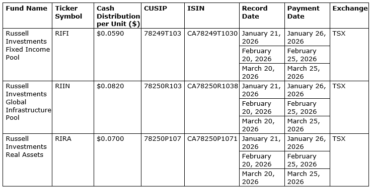 Russell Investments Canada Ltd. has declared cash distributions for the ETF series of certain mutual funds for the months of January, February and March. Unitholders of record of the ETF series, as of the record date, will receive a per-unit cash distribution payable on the payment date.