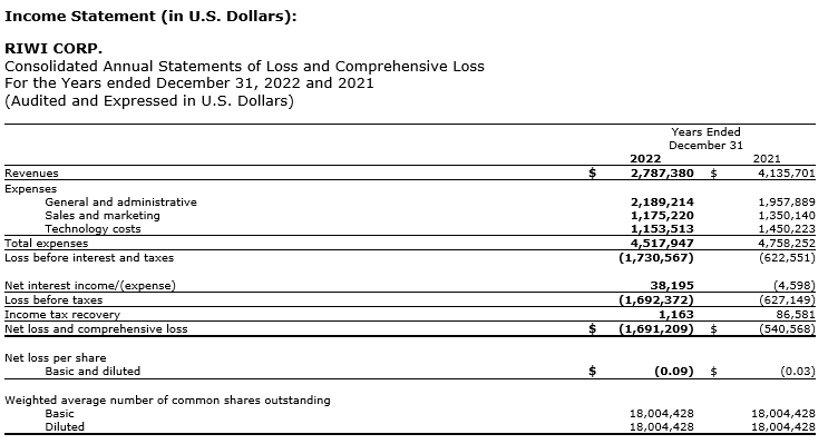 Riwi highlights for the year ended Dec. 31, 2022 -- in U.S. dollars: