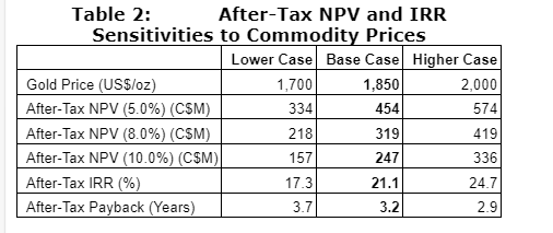 NPV (5 per cent) remains positive for changes of 25 per cent in revenue drivers (commodity prices, grade and recovery), capital expenditure or operating costs. After-tax economic sensitivities to commodity prices are presented herein illustrating the effects of varying gold price as compared with the base case. Additional project sensitivities will be presented in the technical report.