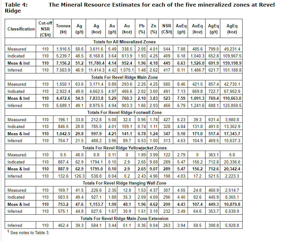 - High-grade underground mine with mineralized material averaging $361/t net smelter return value (diluted) comprising Main zone with 11.43 million tonnes (Mt) averaging 3.80 grams per tonne gold, 37.37 g/t silver, 2.34 per cent zinc, 1.30 per cent lead (diluted) and Yellowjacket zone 340,000 tonnes averaging 8.61 per cent Zn, 2.66 per cent Pb, 65 g/t Ag and 0.07 g/t Au (diluted);