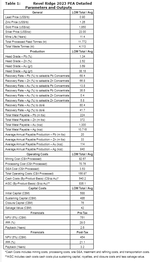 The PEA demonstrates the Revel Ridge project's ability to become a long-life and robust polymetallic gold-silver mine with strong project economics at $1,850 (U.S.)/ounce gold, while today's spot price is over $2,000 (U.S.) per ounce. In addition to the PEA, Revel Ridge has upside potential to expand current mineral resources through continuing exploration diamond drilling, both down dip, along strike and on other occurrences.