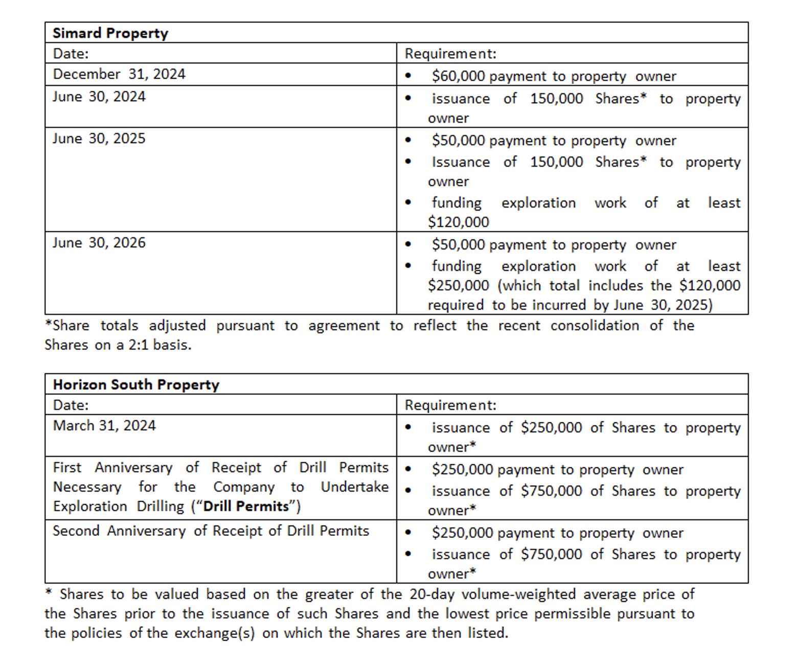 For additional details regarding the property option agreements in respect of the Simard property and the Horizon South property, please see the company's press releases dated Dec. 21, 2022 (in respect of the Simard property), and Feb. 9, 2023 (in respect of the Horizon South property).