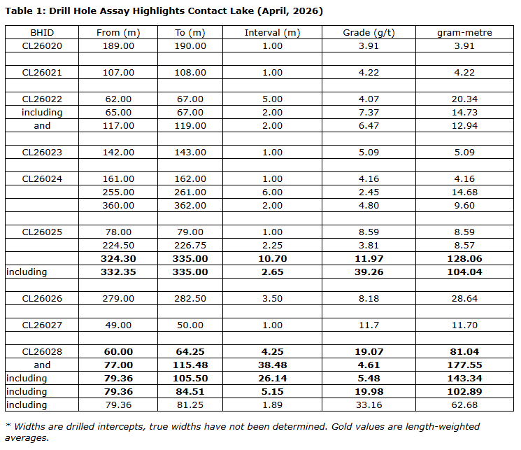 Jonathan Weisblatt, chief executive officer and director, stated: "We are extremely encouraged by these results, which continue to demonstrate the strength and continuity of the mineralized system at Contact Lake. Encountering additional high-grade mineralization both along strike and at depth reinforces our view that we are not dealing with isolated occurrences, but with a growing, cohesive gold system. The scale, geometry and consistency emerging from our drilling are increasingly reminiscent of systems seen in proven gold belts in Canada and globally, and we believe Contact Lake is on a similar trajectory.