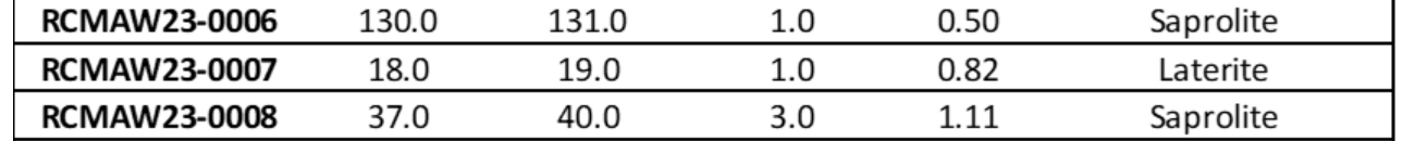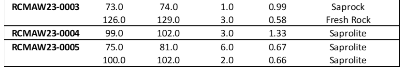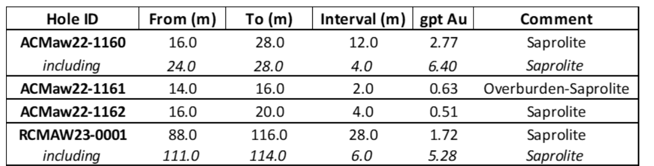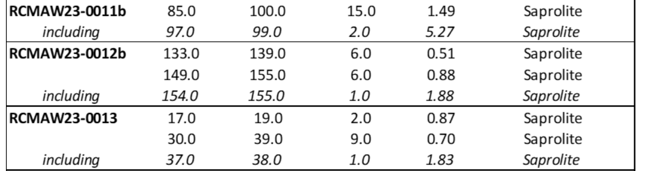 - 1.49 g/t gold over 15 m from drill hole RCMAW23-0011b from 85 m: