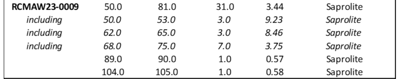 - 3.44 g/t gold over 31 m from drill hole RCMAW23-0009 from 50 m: