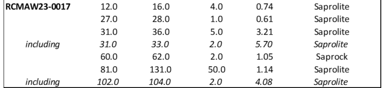 - 1.14 g/t gold over 50 m from drill hole RCMAW23-0017 from 81 m: