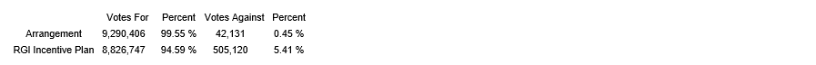 The detailed results of the votes held at the special meeting of unitholders regarding the arrangement and the RGI incentive plan are set out in the attached table. These results reflect voting of 82.3 per cent of all trust units outstanding, either by proxy or in person.