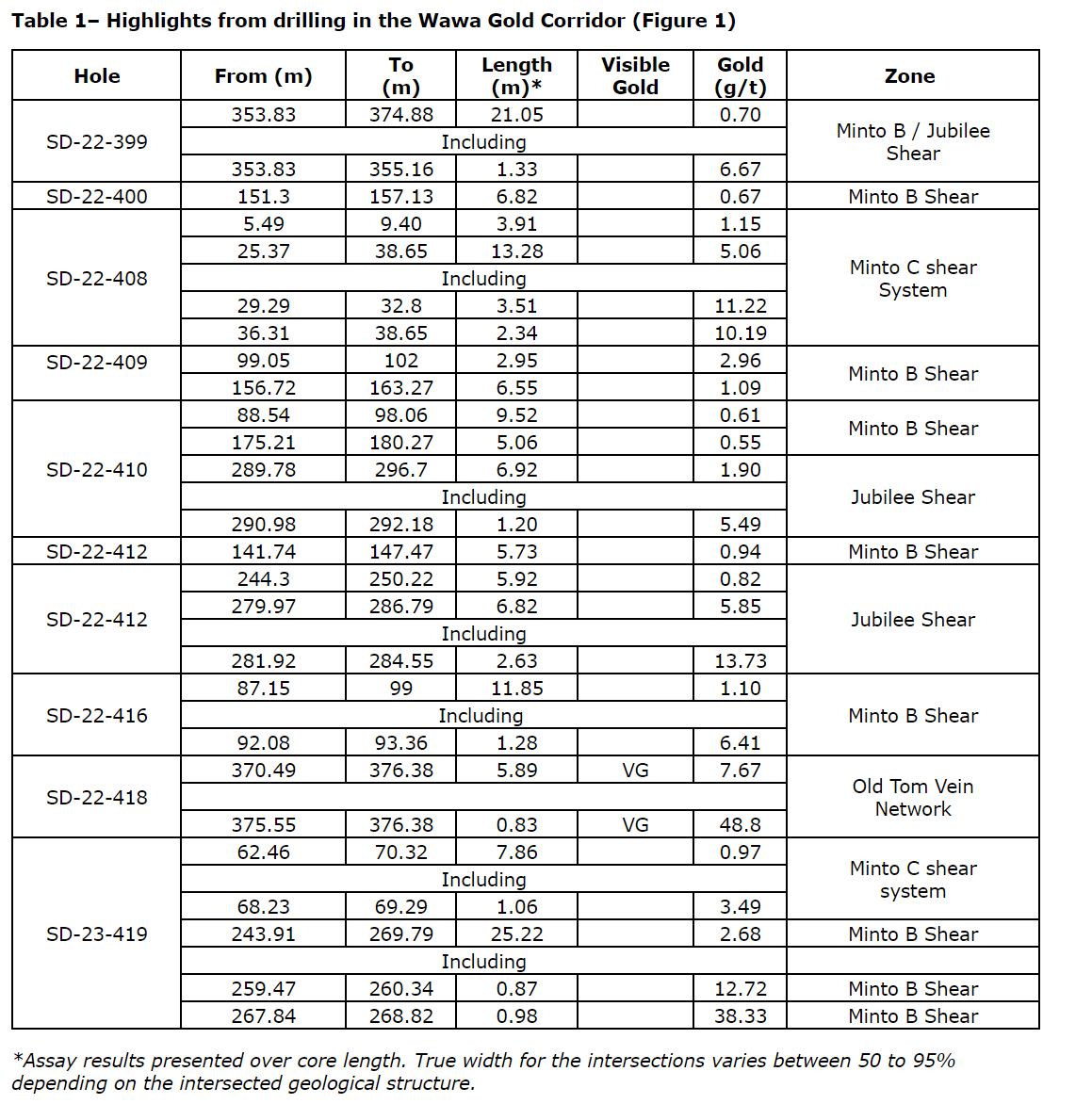 Other intersections in the Old Tom Vein Network include 70.9 g/t gold over 1.14 m in SD-22-414 and 2.06 g/t gold over 11.45m, including 13.00 g/t Au over 1.00 m in SD-22-417 (see press releases of February 16th and 23rd 2023)
