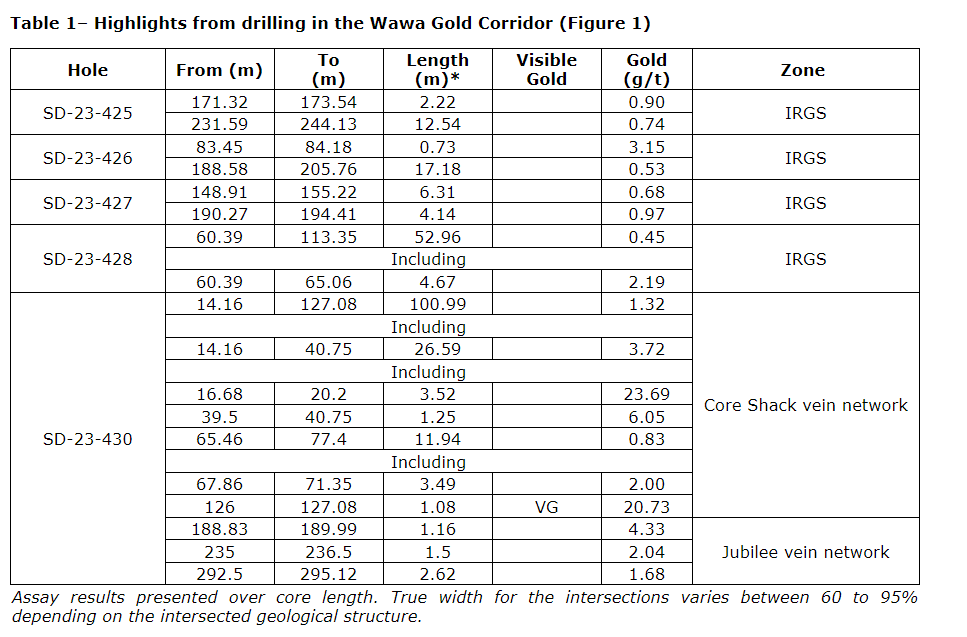 - SD-23-428 intersected a near-surface extension of the IRGS with 0.45 g/t gold over 52.96 metres, including 2.19 g/t gold over 4.67 metres;