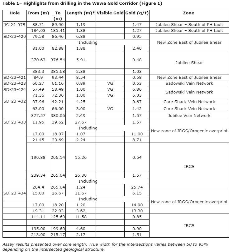 "The new results from this systematic drill program of the Wawa gold corridor (planned for the revised resource) confirms the presence of near-surface and significant gold mineralization west of the Jubilee shear and lies very close to the 2019 resource of the Surluga deposit. Mineralization is open in all directions, and we now have additional evidence that high-grade gold zones can be present in the intrusion-related gold system."