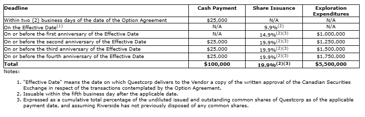 During the term of the option agreement, Riverside, through the vendor, will remain the program operator for the project using its local team based in Hermosillo, Sonora. Following exercise of the option under the option agreement, Questcorp will grant Riverside a 2.5-per-cent smelter return royalty on commercial production from the project.