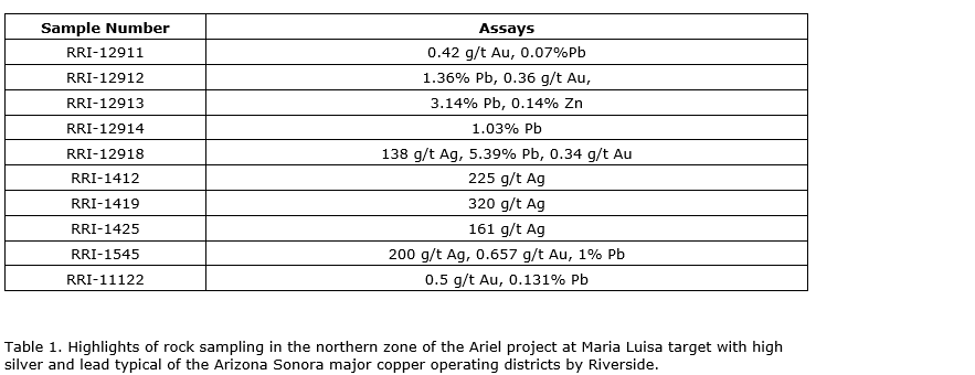 Building on Riverside's consolidation of the Ariel project through acquisition of the adjacent Maria Luisa concessions, the company has now conducted expanded early 2026 fieldwork, and has received high-grade silver and lead samples from veins, porphyry-style alterations and turquoise mines that are all part of the advancing target definition work with detailed mapping, sampling, alteration mineral studies. These high grades are significant because they are comparable with those seen in other major Arizona-Sonora mining camps, where early mining of silver veins later evolved into major copper discoveries at more than a dozen large mines, including Cananea, La Caridad, Bisbee, Resolution, Morenci and Ray, to name a few.