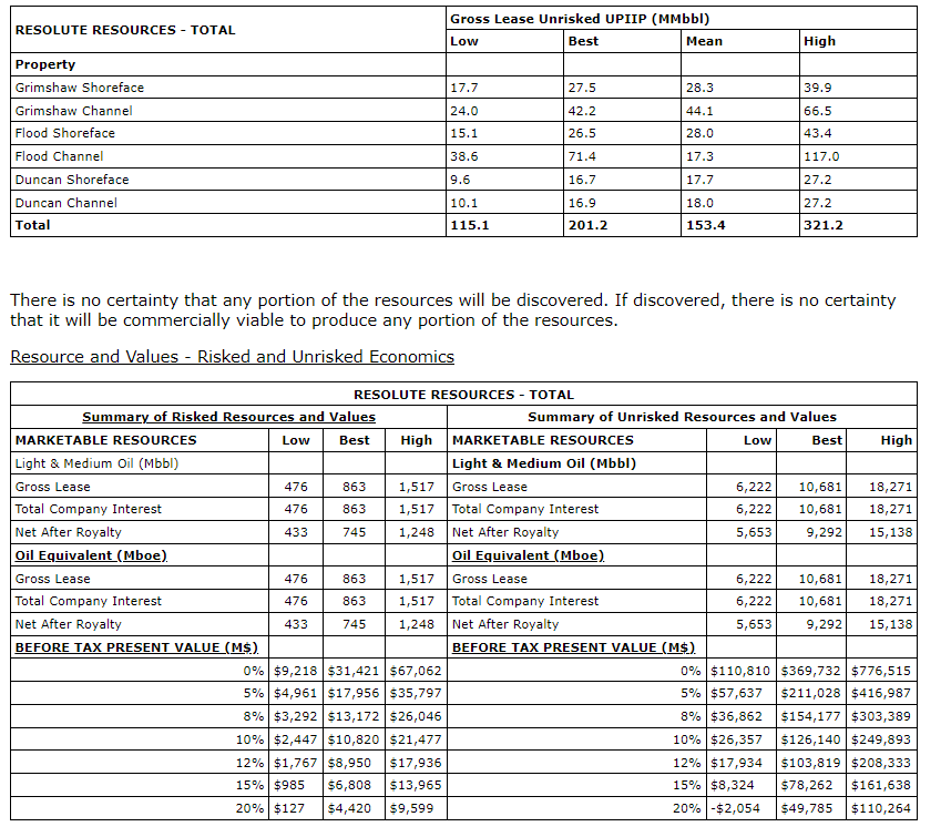 The report covers 38 of the 53.5 sections that Resolute is the 100-per-cent working interest owner in its light oil Grimshaw, Flood and Duncan project. A summary of certain findings of the report are as follows:
