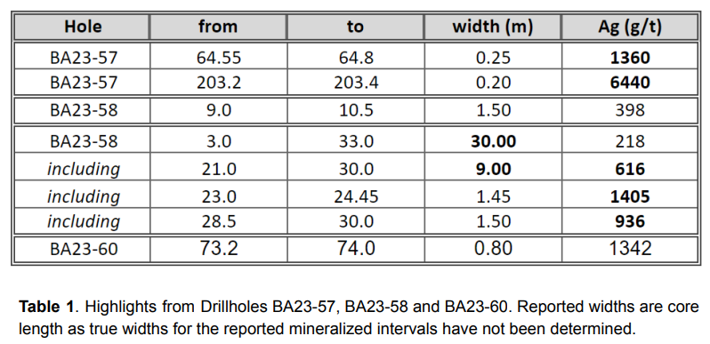 - Hole BA23-58 cut nine m of 616 g/t silver within an overall structure of 30 m width running 218 g/t silver, including 1.4 m of 1,405 g/t silver (see the table entitled "Results from BA23-58 of the full 30 metres grading 218 g/t Ag from three to 33 metres").