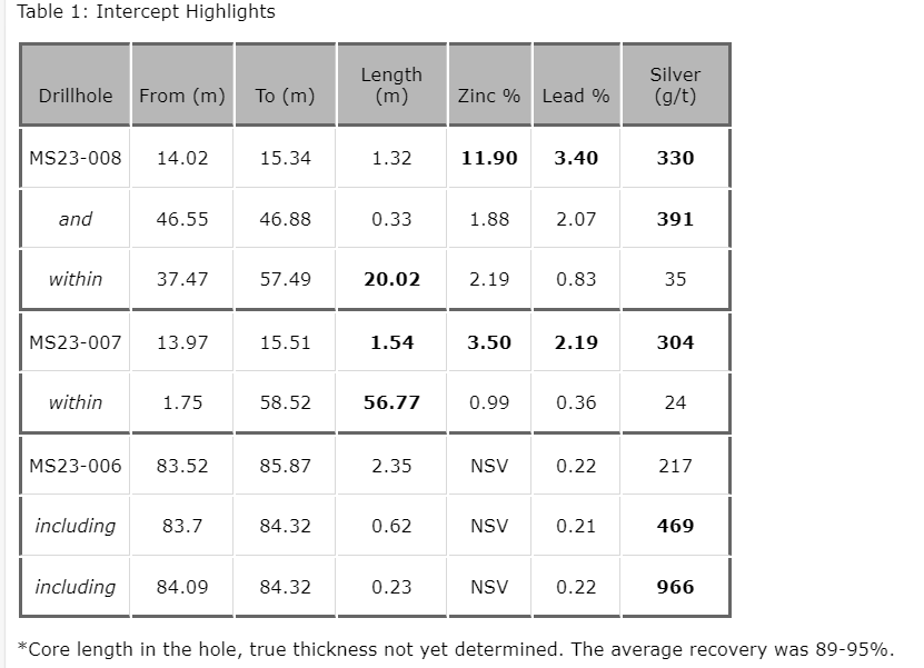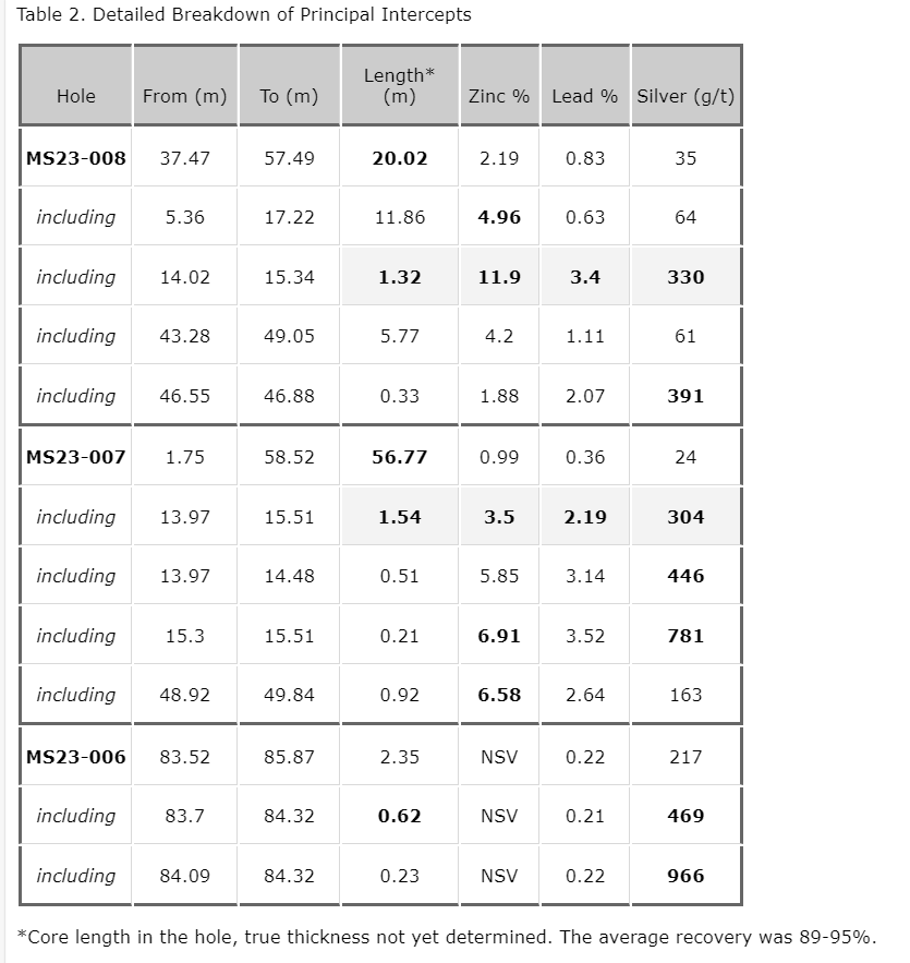 - MS23-008 within 44 metres of dispersed mineralization cut several high-grade veins, the best of which was 1.32 metres grading 330 grams per tonne silver, 11.9 per cent zinc and 3.4 per cent lead.
