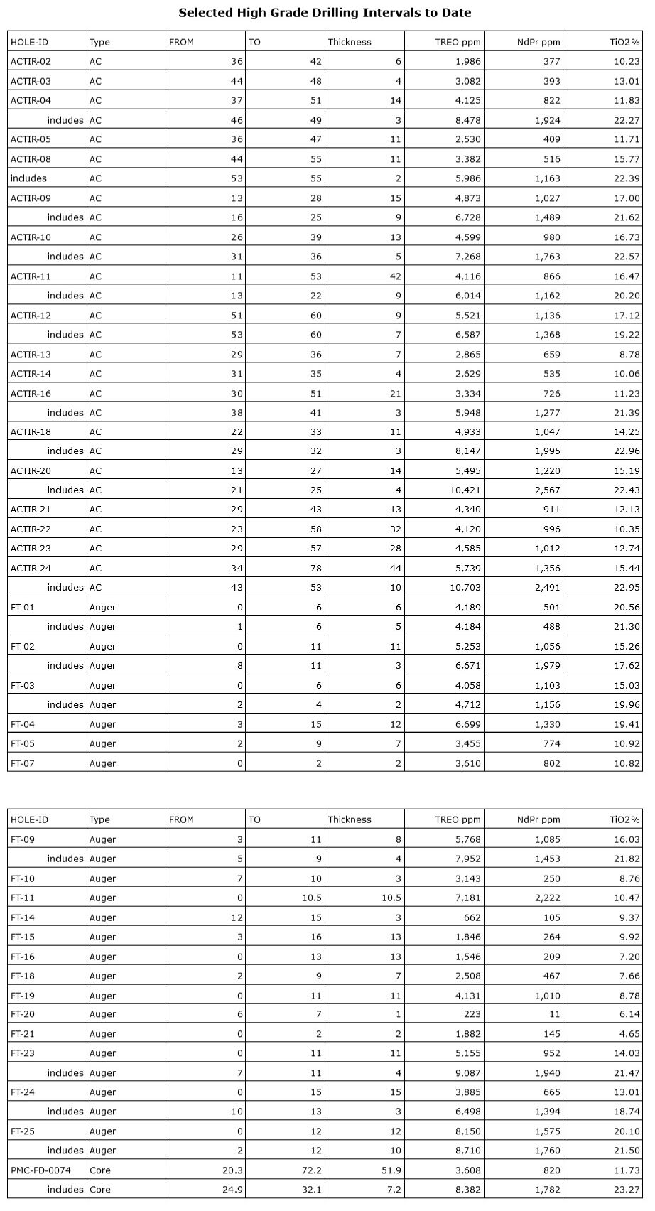 38 metres at 6,444 ppm TREO with 1,524 ppm NdPr and 17.5% TiO2 from 40m (Aircore)